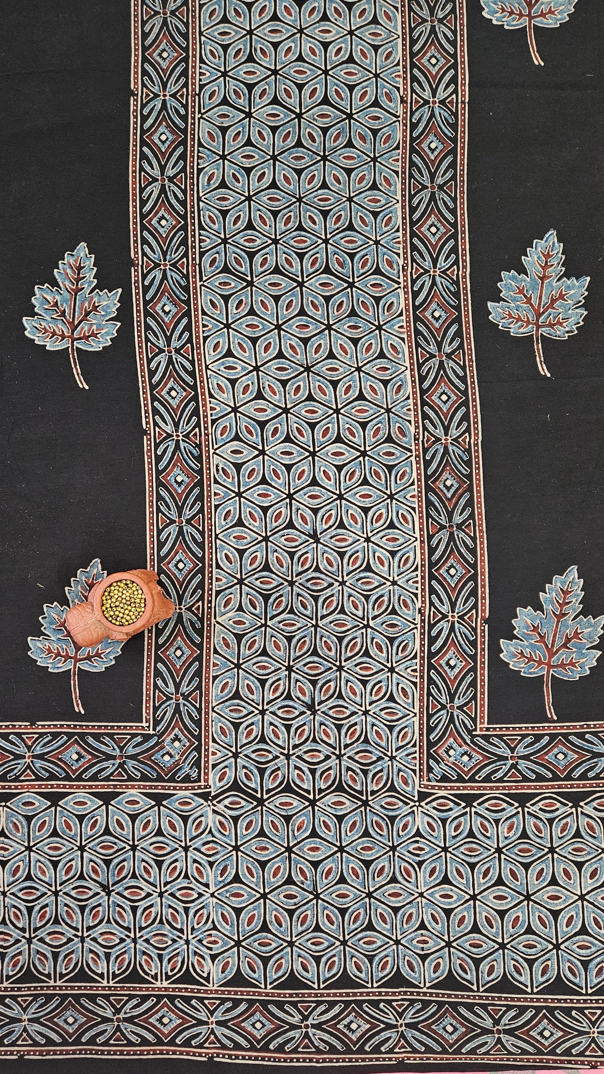 Black maroon'n'blue ajrakh print kurta material with front panel and printed ghera printed with motifs all over -2.50mtrs