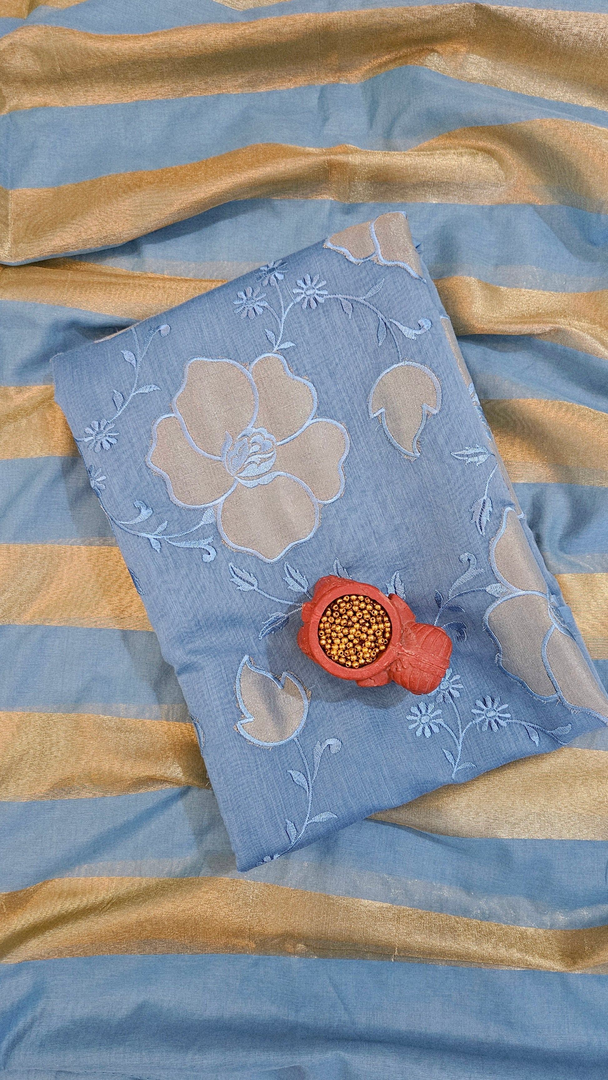 Blue'n'gold mul chanderi suit with striped dupatta