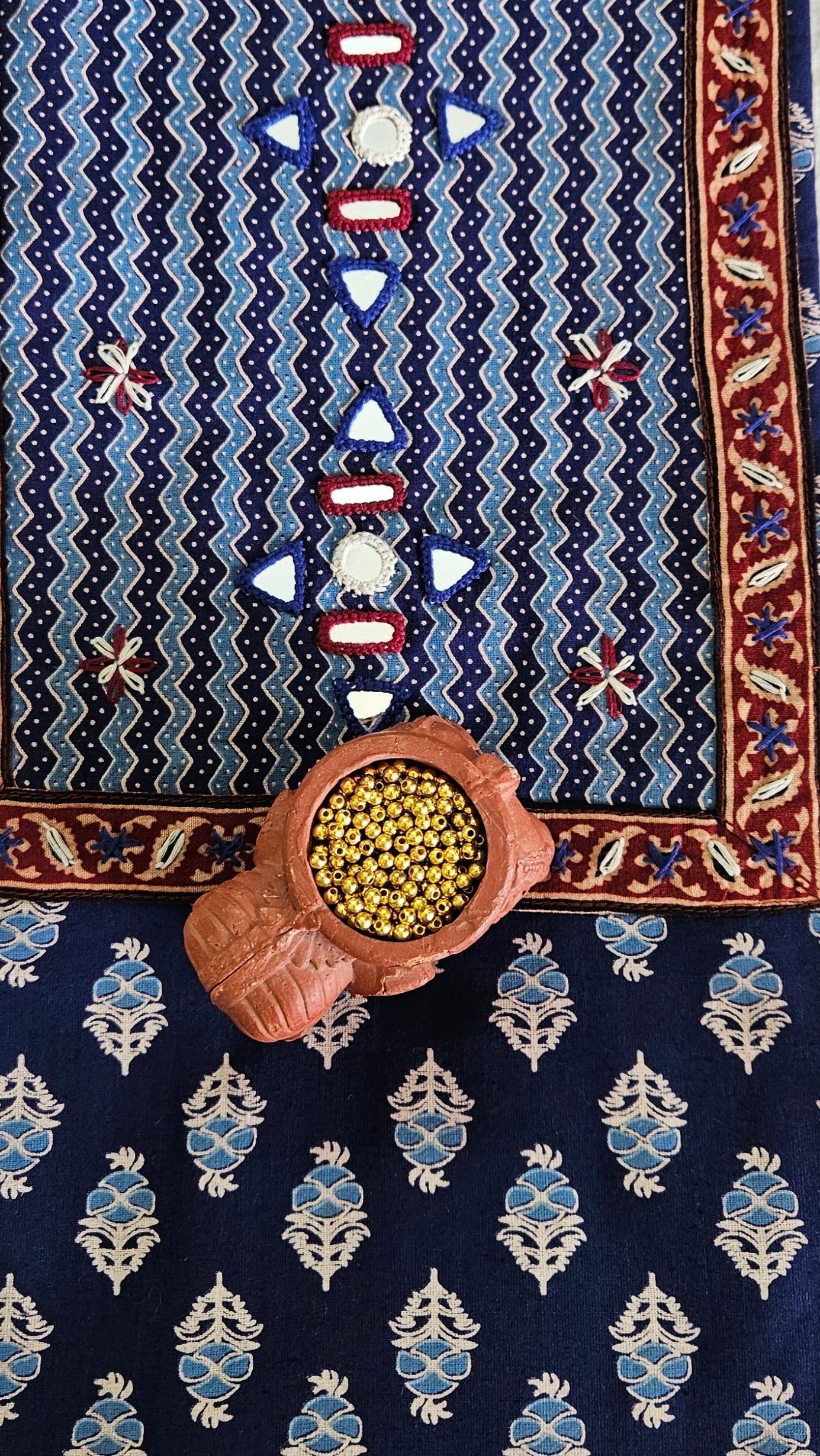 Indigo gamthi print cotton kurta material with hand embroidered yoke. -2.40mtrs