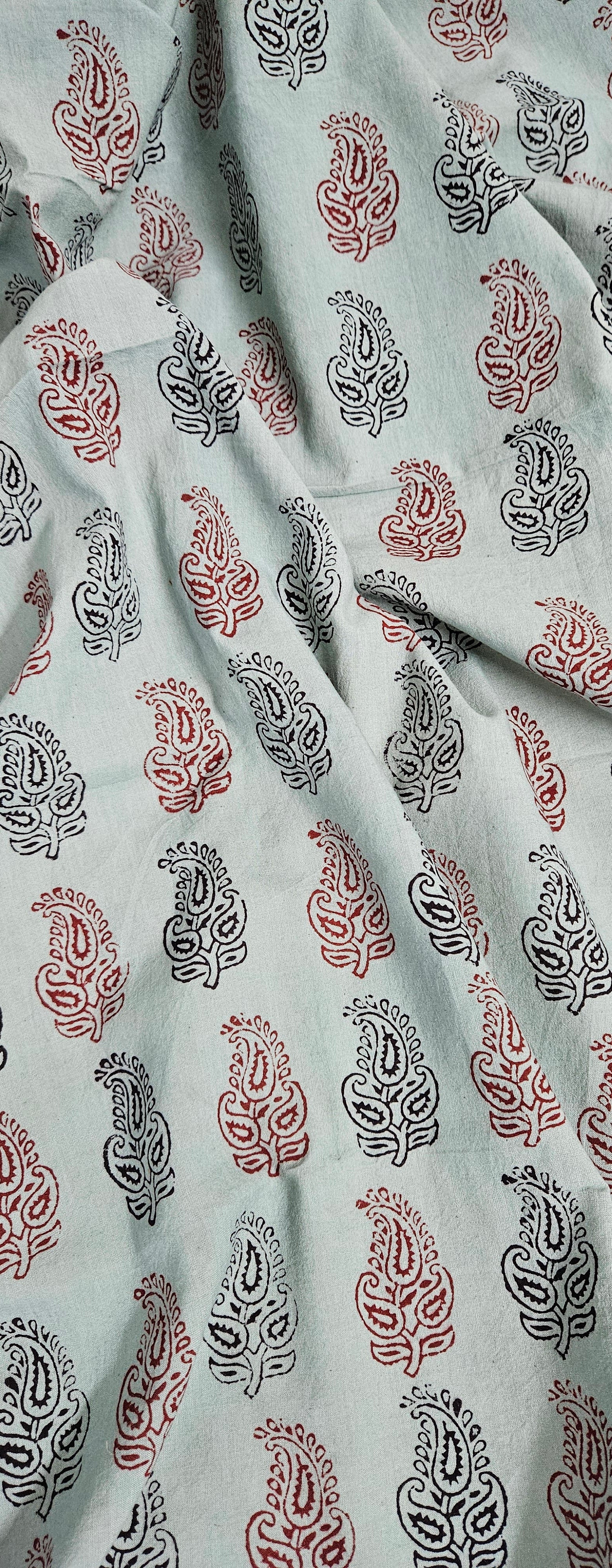 Light teal'n'maroon hand block cotton kurta material with border, length -2.50Mtrs