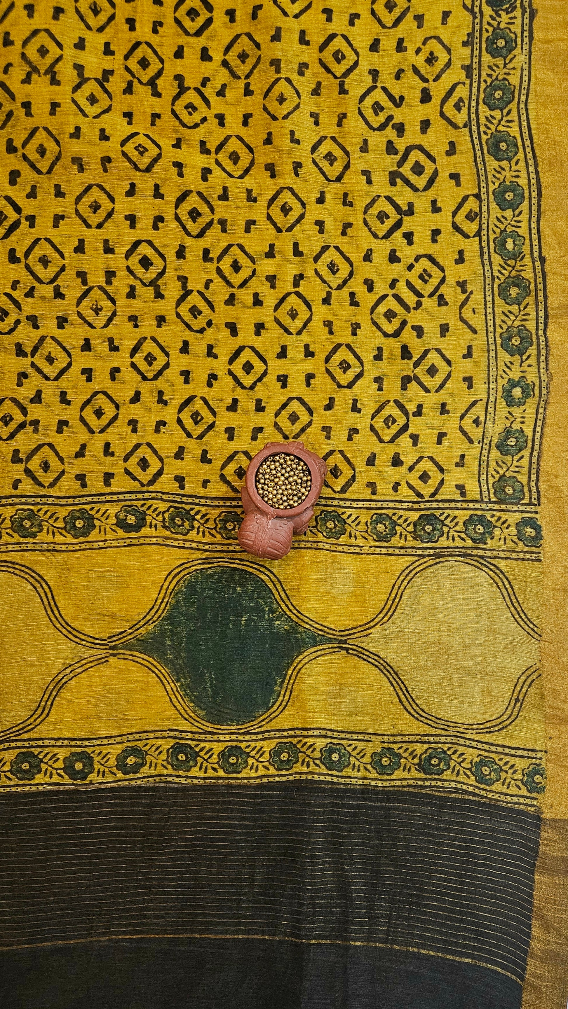 Mustard yellow linen silk dupatta material with ajrakh print motifs and ajrakh printed tissue pallus -2.50 mtrs.