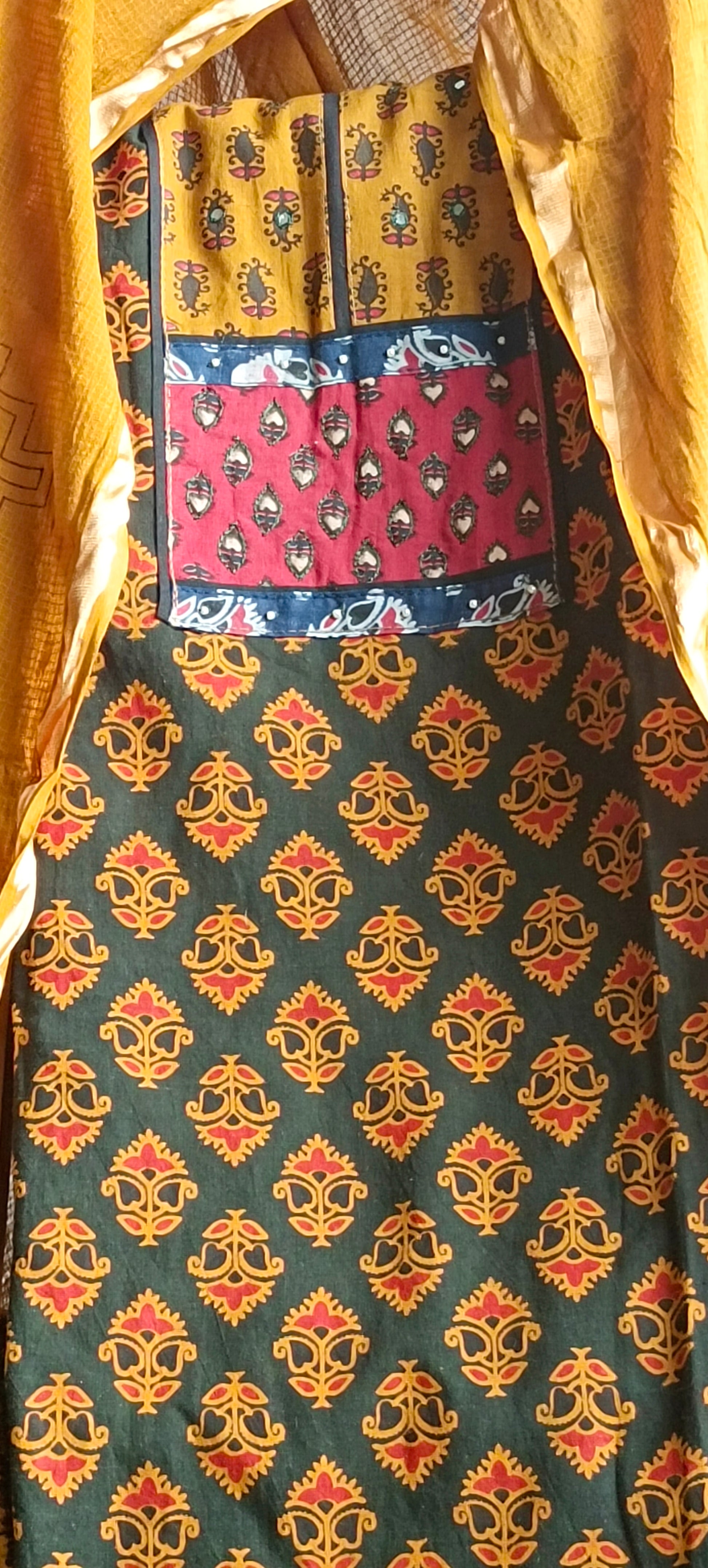 Green'n'red gamthi print kurta with yoke embroidery and patch work.Top- 2.5 Mtrs