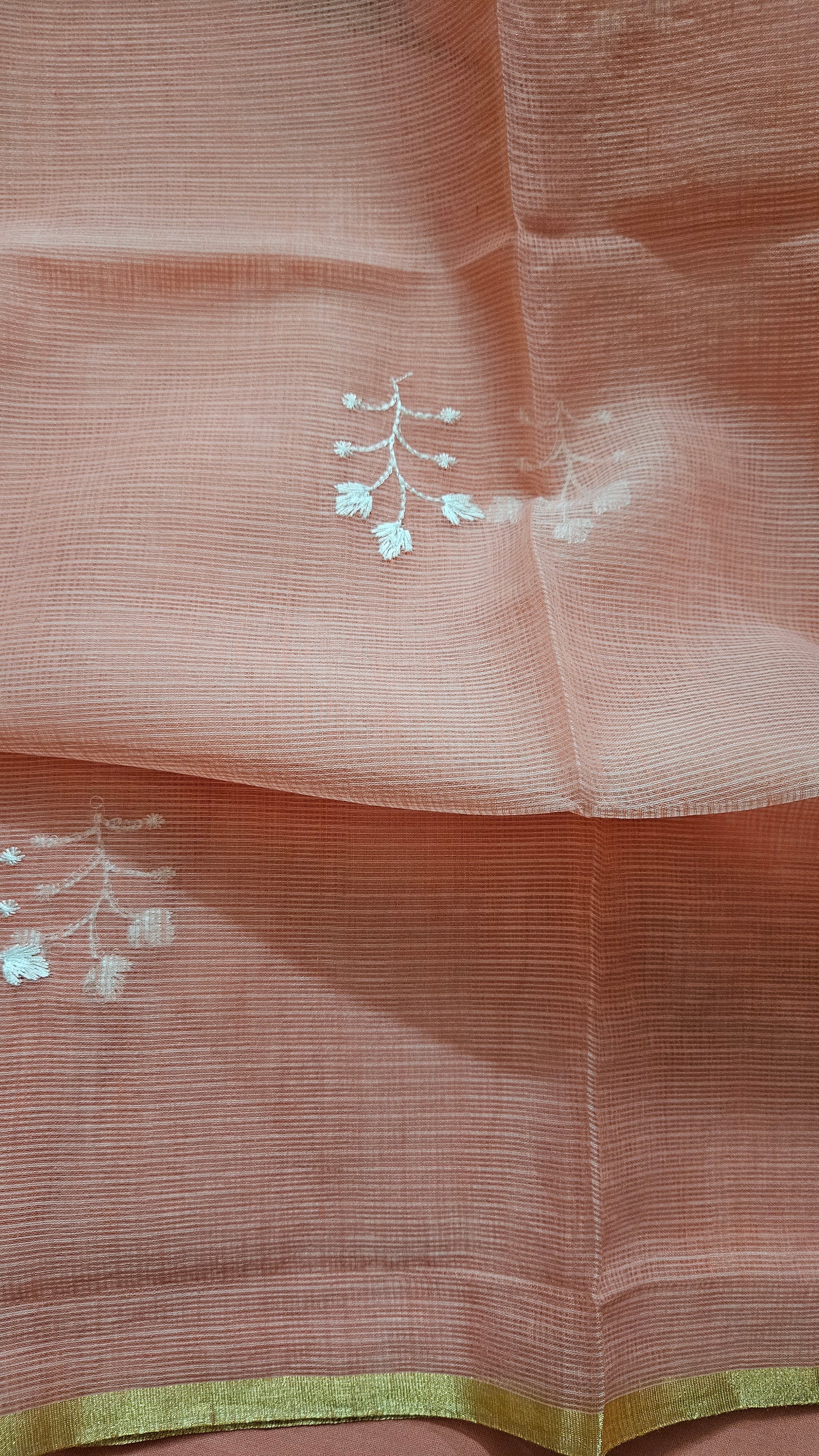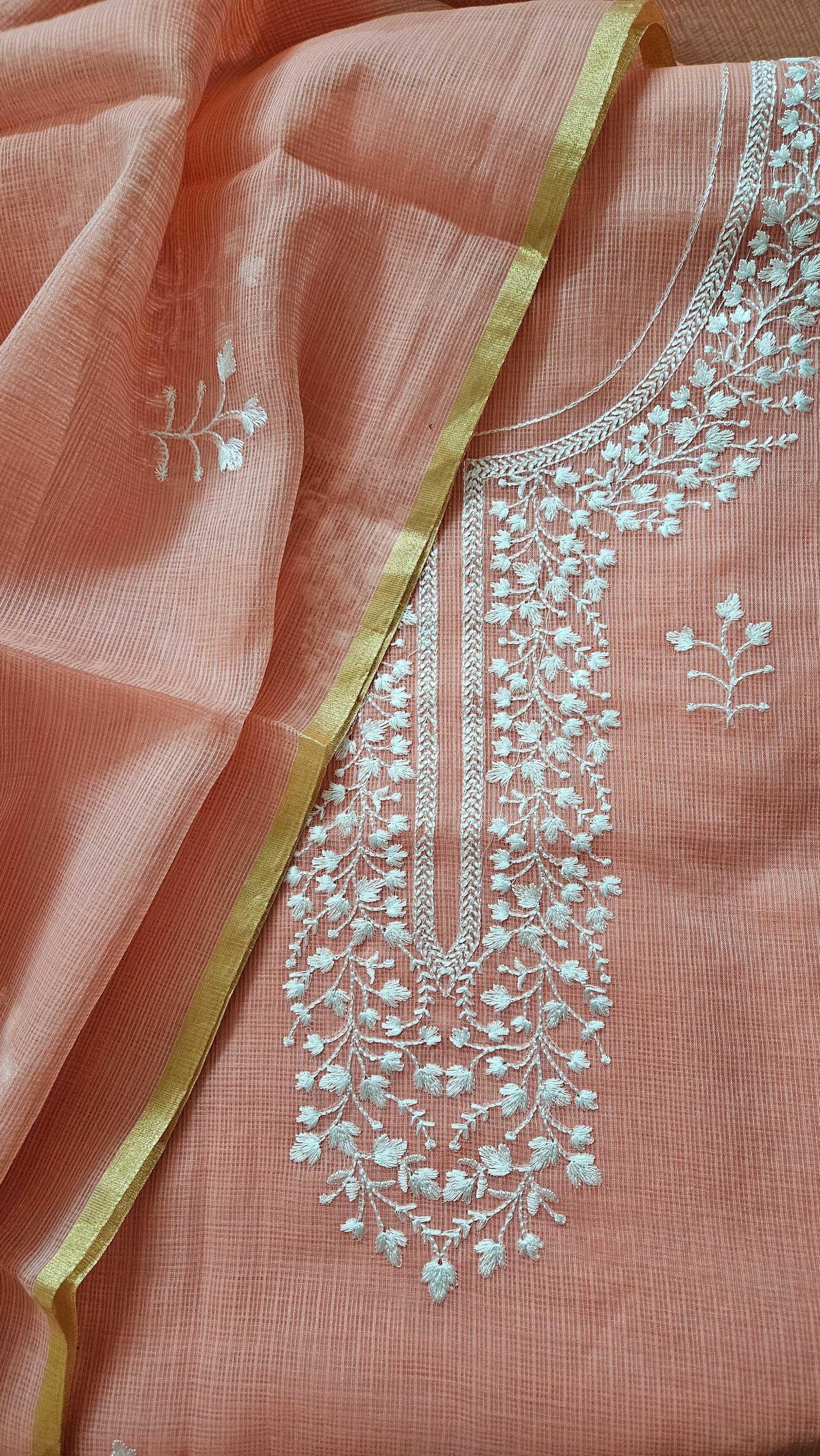 Peach Kota doria kurta material with thread embroidery at yoke and motifs all over -2.50mtrs.