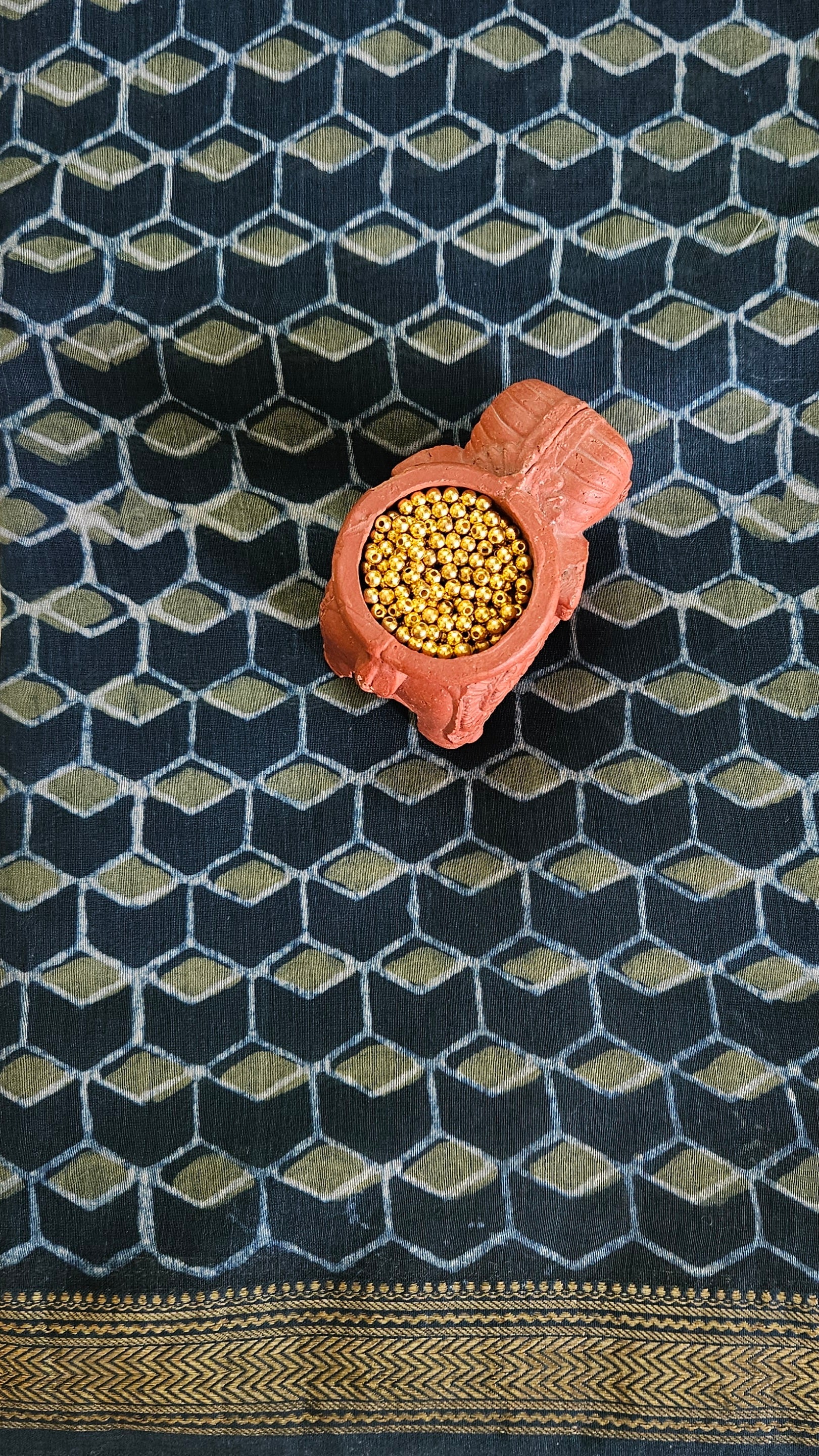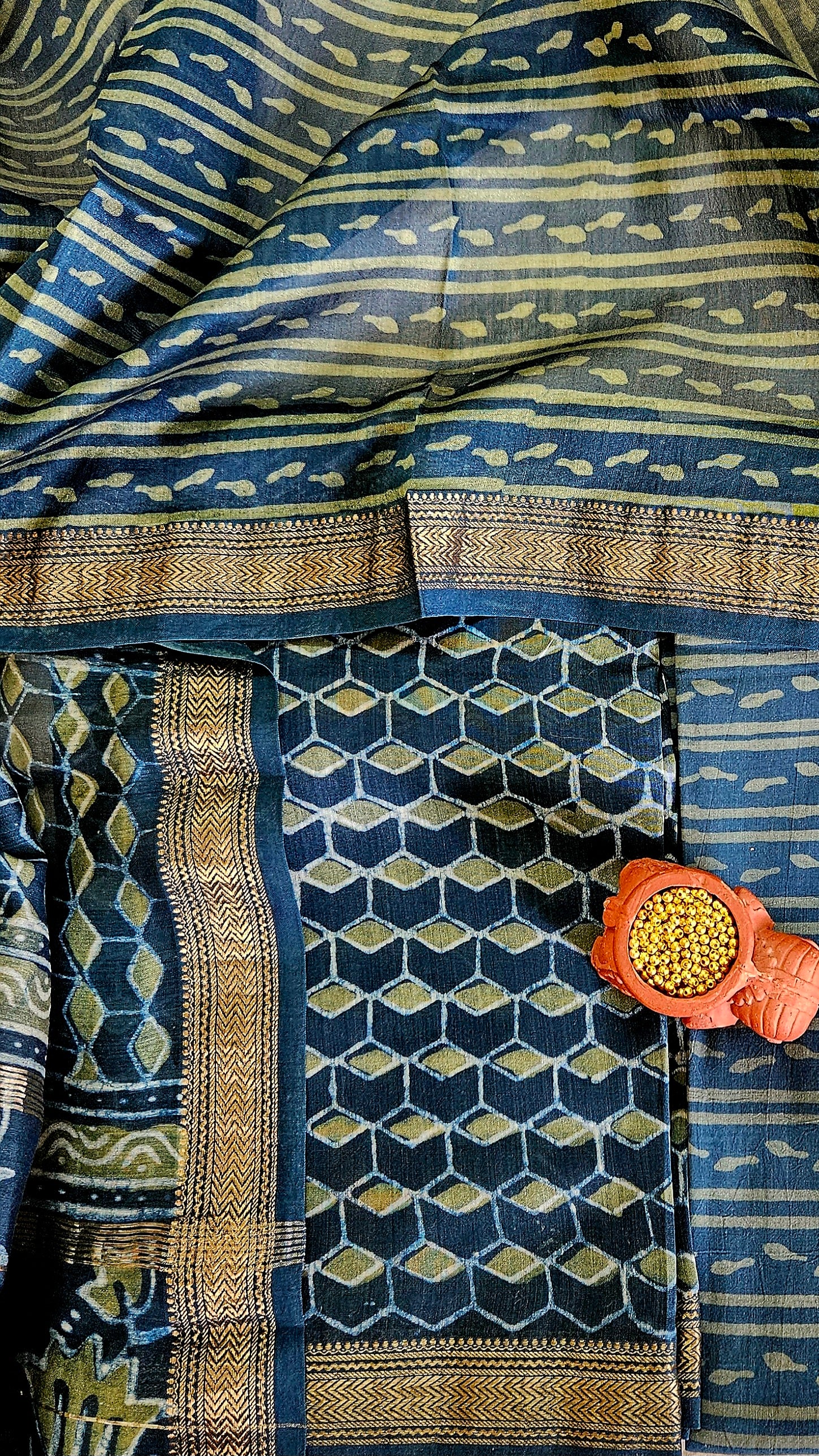Peacock'n'sage green maheshwari silk hand block printed dupatta material with tissue pallu -2.50mtrs