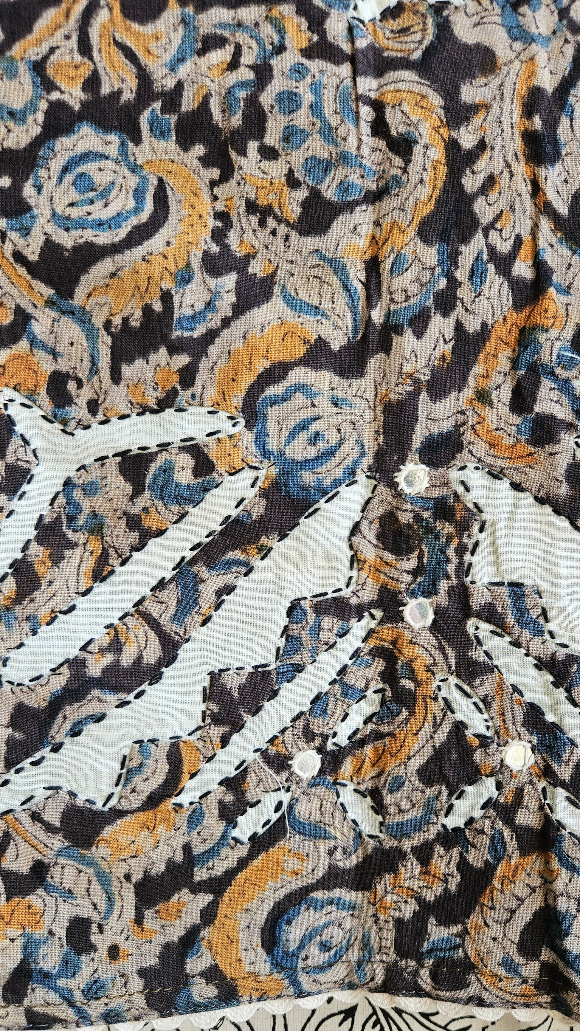 Pure cotton black,mustardand blue intricately designed kalamkari suit with applique work on ghera