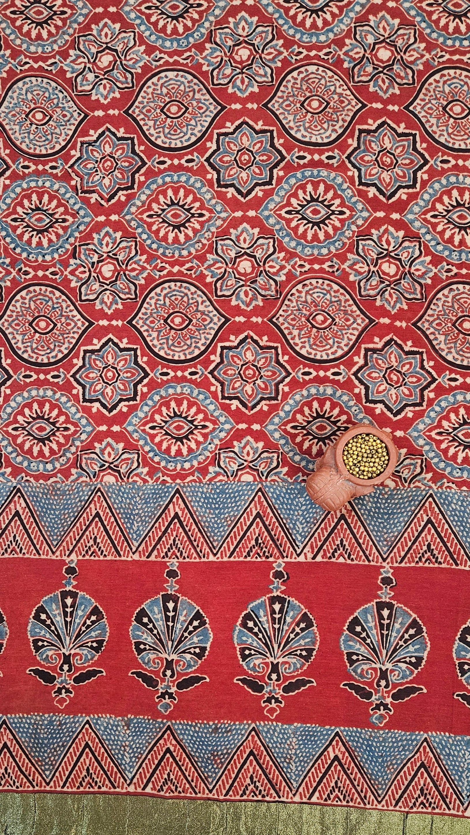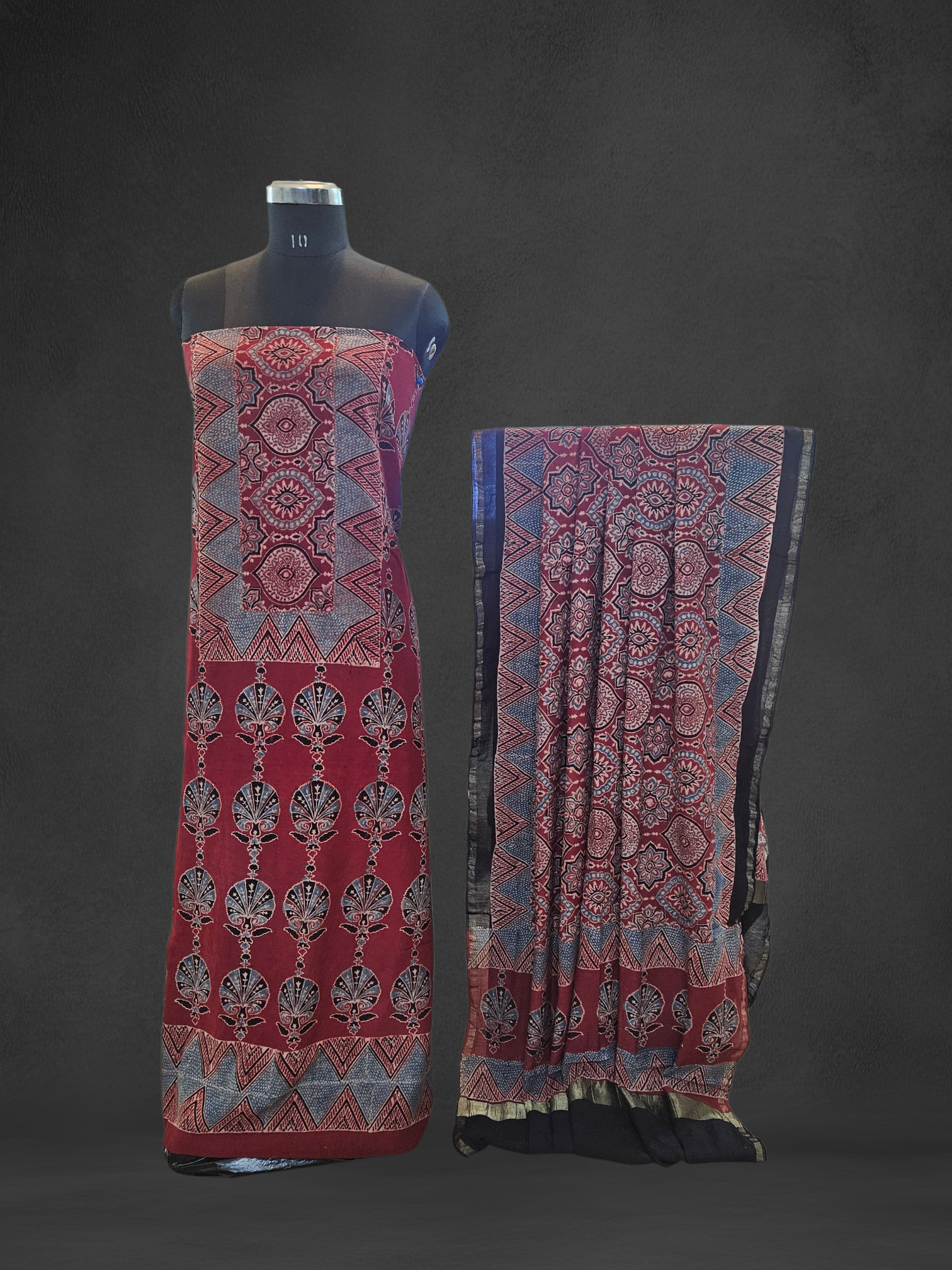 Red blue'n'black ajrakh print Chanderi suit
