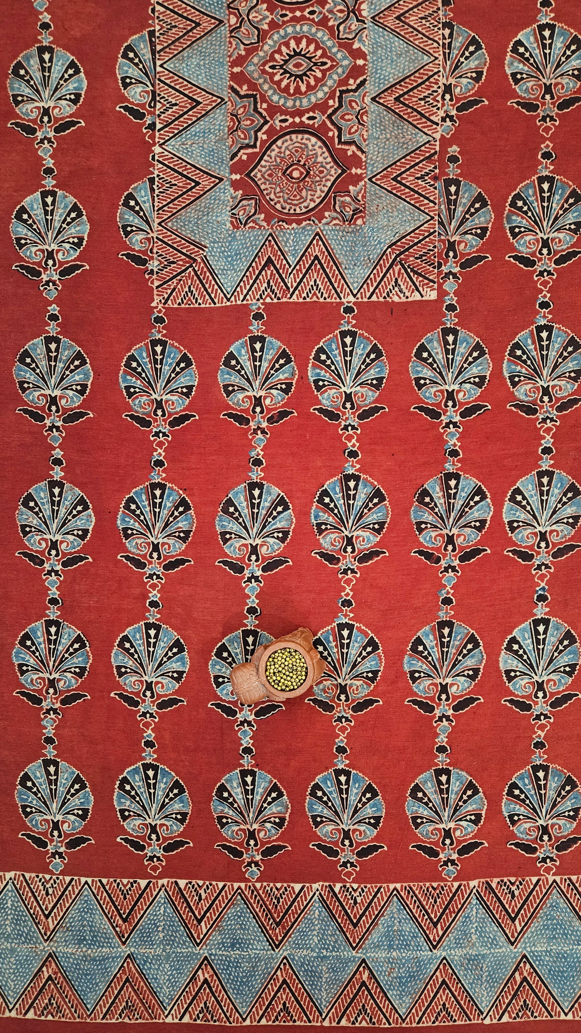 Red blue'n'black ajrakh print kurta material with neck yoke -2.50mtrs