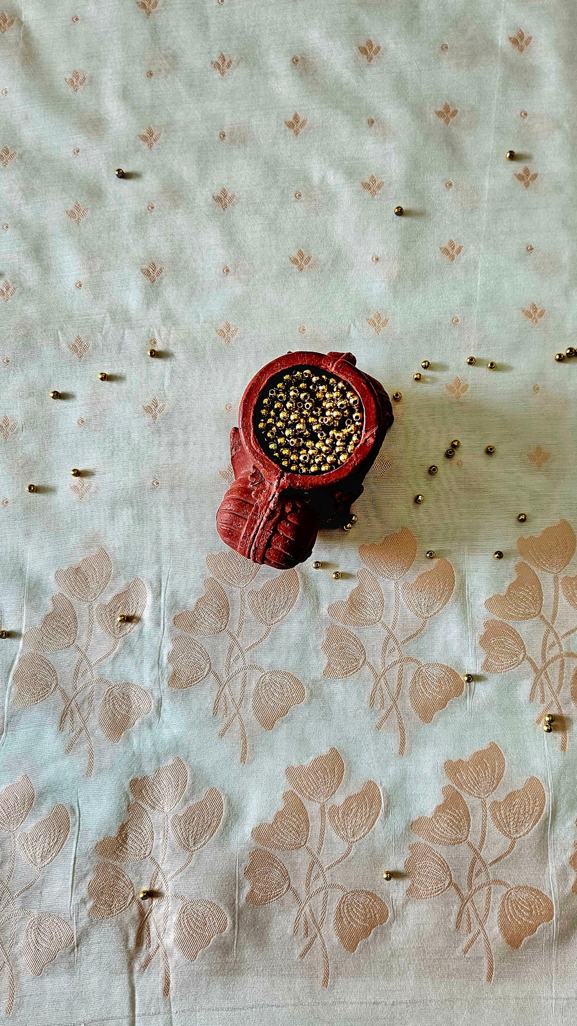 White and peach resham weave banarsi cotton dupatta material with small motifs all over and four sided resham weave border. -2.50mtrs